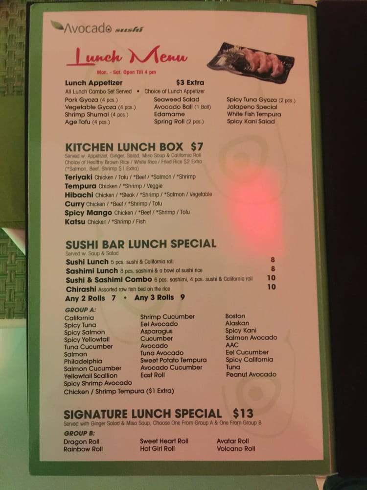 Customers rave about their lunch specials, which include bento boxes with a selection of tasty dishes. Whether you're dining in or ordering delivery, you can expect quick and attentive service, along with a clean and modern atmosphere. With a diverse menu featuring options like bomb rolls, soft shell crab tempura, and beef teriyaki, Avocado Sushi is a must-try for any sushi lover.